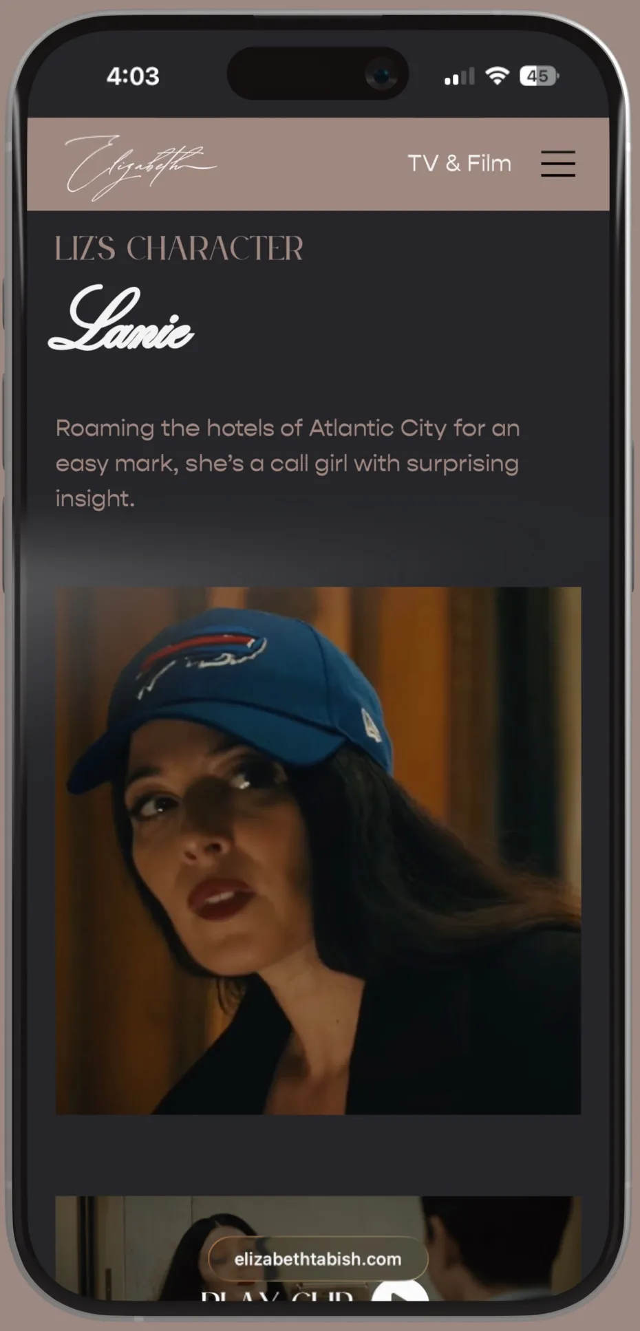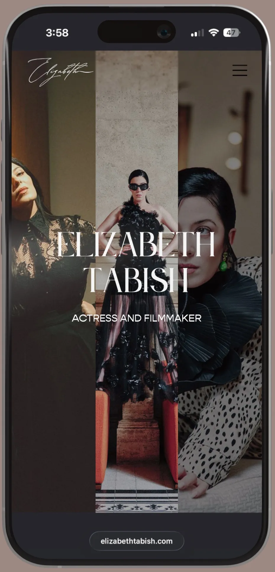 When Elizabeth Tabish came to us, her career was expanding quickly across acting, directing and writing, but her online presence hadn’t kept pace. She needed a digital identity that felt as nuanced, expressive and multidimensional as her work. We began by crafting a new web experience through punchy UX/UI design and a fully custom Webflow development, building a cinematic visual language that honored her artistry without overwhelming it. A bespoke CMS architecture gave structure to her growing catalog of films, performances, press and creative projects, turning scattered information into an elegant, living portfolio that can evolve as her career does.